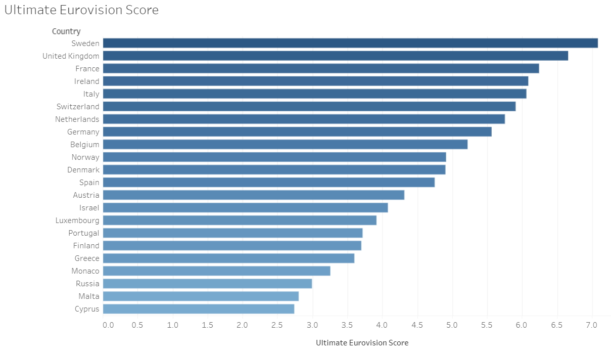 "To compensate for NQs [nonqualifyings] and the fact that countries have continuously been added to the competition over the years, let’s do some more math. If we divide the number of years a country has participated by their average placing in the final, creating an “Ultimate Eurovision Score,” we may get a more accurate result of who “The Best” Eurovision country might be."